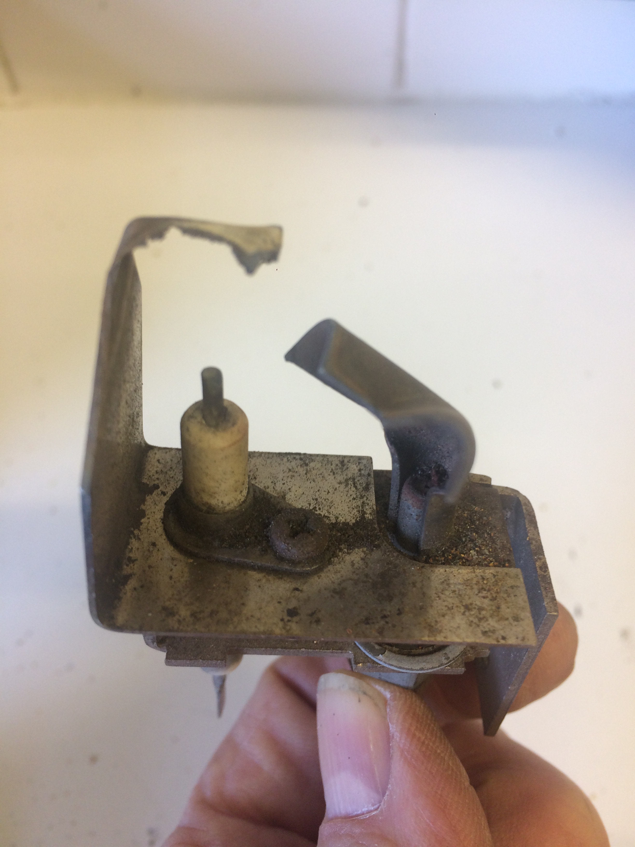 The eroded top section in the left hand photo is significant because the process by which the control board detects the pilot flame, relies on the surface area of the horizontal tongue above the spark electrode being correct. When it erodes away like in the left hand photo, flame detection becomes unreliable and the main burners in the boiler fail to light. The classic indicator of this fault on a Netaheat Electronic is the pilot flame igniting and being visible in the very back of the combustion chamber through the viewing hole, but the ignition sparking continuing although the flame is actually alight. The control board cannot detect the pilot flame due to the eroded electrode, so continues to try to light it (even though it is already alight) and does not light the main burner.